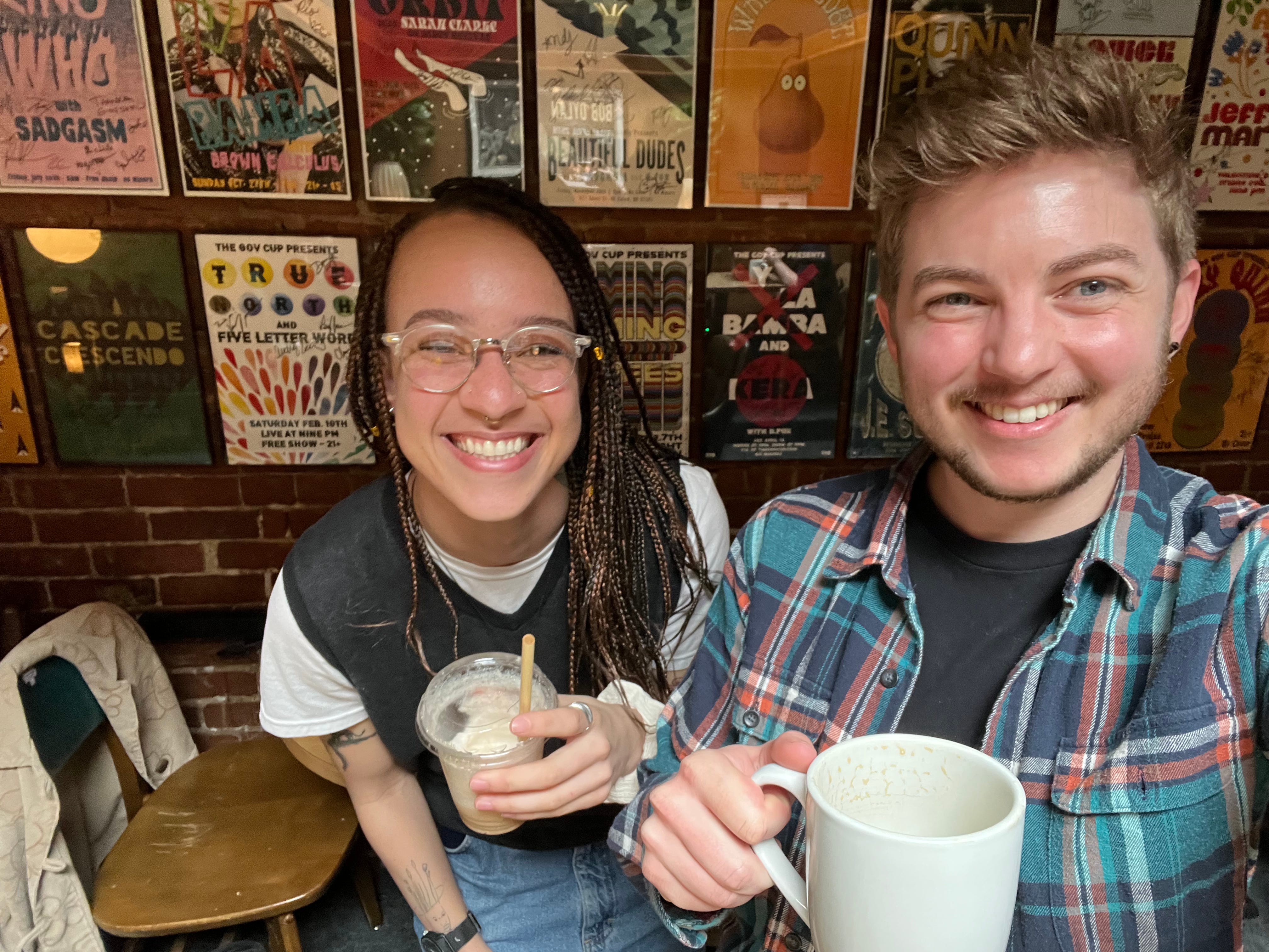 I just got back from an amazing trip out to the Pacific Northwest (which is why there wasn’t a newsletter last week). A big part of that trip was attending the book launch for Oakley Rae Phoenix’s book The Gender Friend. In the book, Oak goes on a few imaginary coffee dates with the reader to have an open, casual conversation about gender. I replicated this format in the foreword I wrote for the book, imagining Oak and myself grabbing coffee together. So when we manifested that rhetorical device and actually got coffee in-person last week, you know we had to take a photo of it: